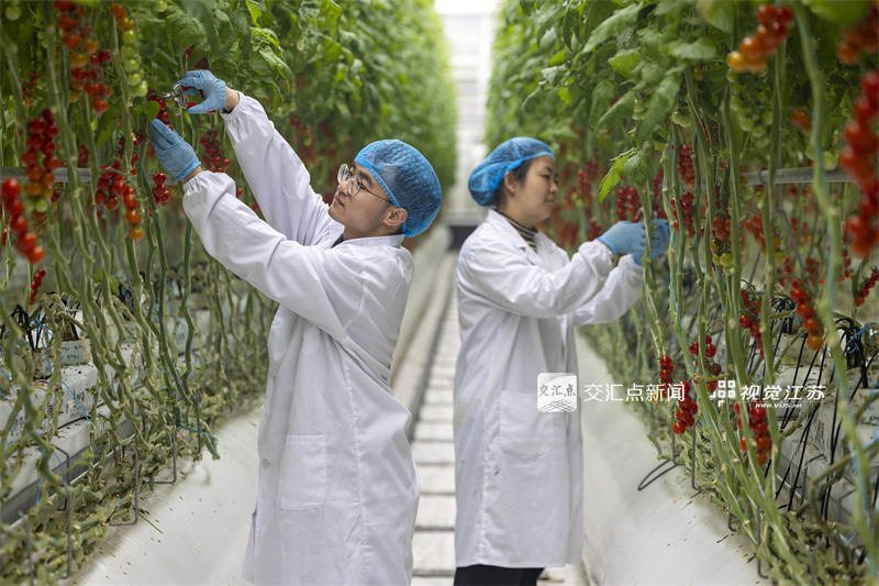 3月13日 泰州工作人员在姜堰区溱湖智慧农业园数字化工厂内采摘小番茄。近年来,溱湖智慧农业园数字化工厂通过无土栽培、智能水肥一体化等技术,番茄产量达传统种植的5至10倍,节水节肥超50%。汤德宏 摄