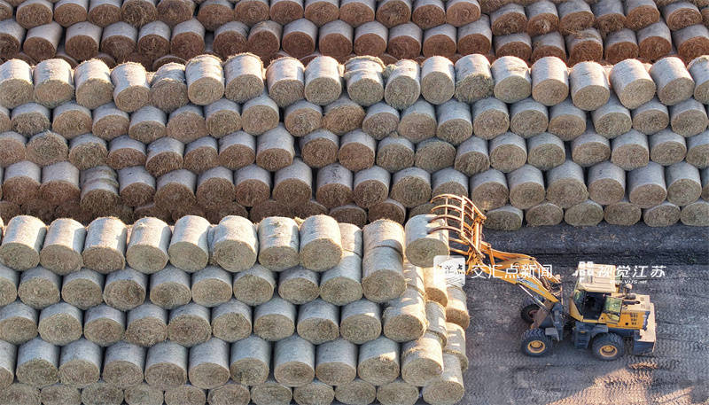 11月21日 南通工作人员正在海安市墩头镇禾庄村春荣家庭农场,将打捆好的水稻秸秆进行集中堆放。近年来,海安市围绕秸秆能源化、肥料化、饲料化等进行秸秆综合利用,推进农业绿色低碳发展。周强 摄