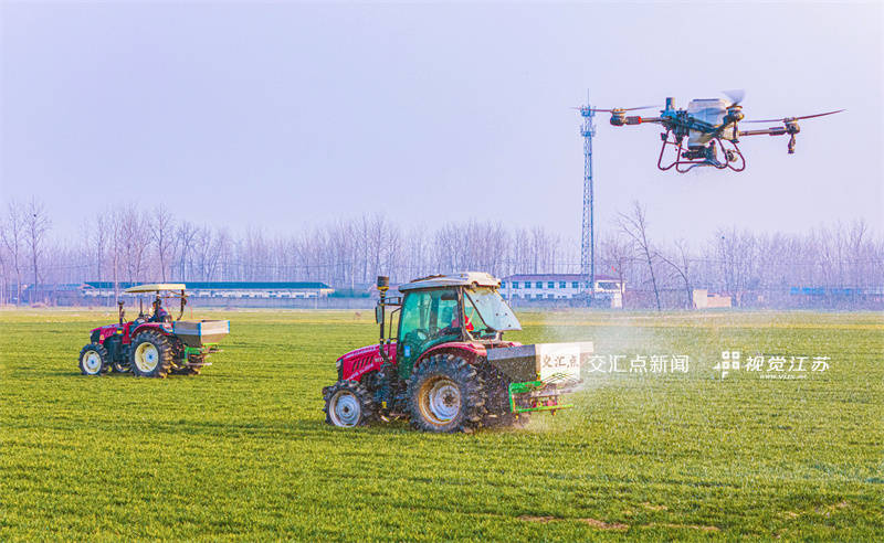 2月27日 宿迁轮式拖拉机和植保无人机正在宿城区陈集镇鲍河村麦田里进行立体式管护,提高田管效率。徐江海 摄