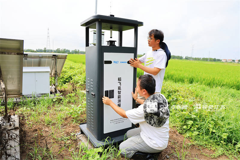 8月27日 连云港农技人员在岗埠农场田间查看水稻苗期,运用智慧农业全域农情测控平台,对气象数据、积温积光、土壤墒情、病虫害发生情况等进行智能化综合监测。徐卫 摄