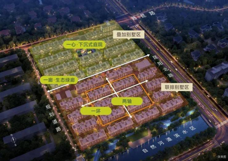 尚园整个地块方正,以滨水森屿的围合界面。以东西向绿廊“一廊”为界,北侧四叠墅区,南侧联排别墅区。北侧以下沉庭院为“一心”(中庭景观王座由来),中央开放式空间,增强社区邻里交流的归属感。南侧“一环两轴”,强调“有天有地有花园”私人领地、领空绝对拥有感。