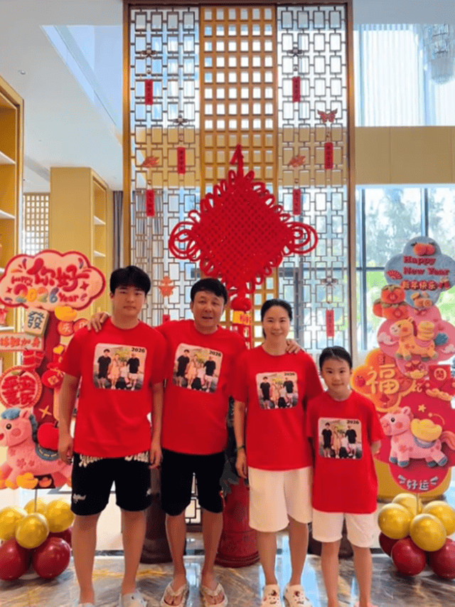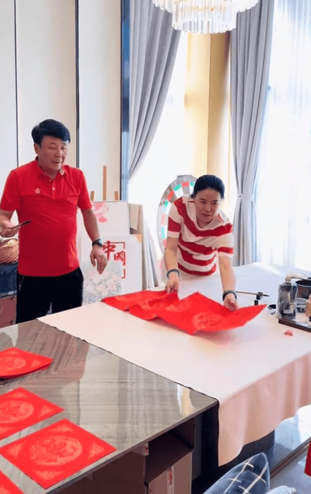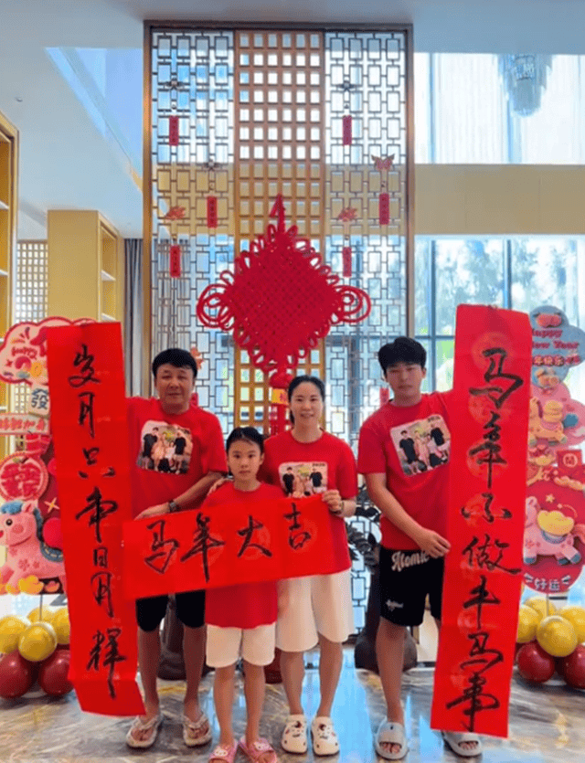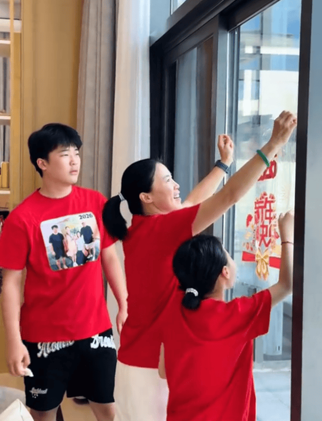 而在老公写得差不多的时候,王楠带着儿女贴窗花和对联。贴春联的王楠还特意换上了定制的T恤,大红T恤上印有一家四口合照。据悉,每年王楠都会为家人定制这样一件T恤,喜庆又有节日的仪式感。