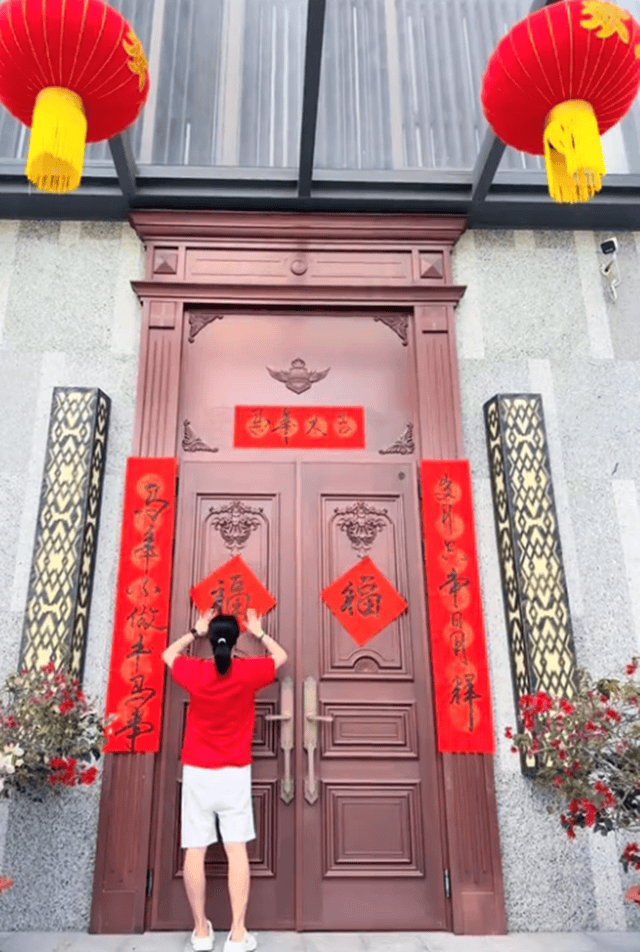 下图中给大门贴春联的王楠,朱红色大门看着有五米高,十分气派。在三亚住别墅的王楠一家,别墅里还有露天泳池,一家人住在这里真是享受。