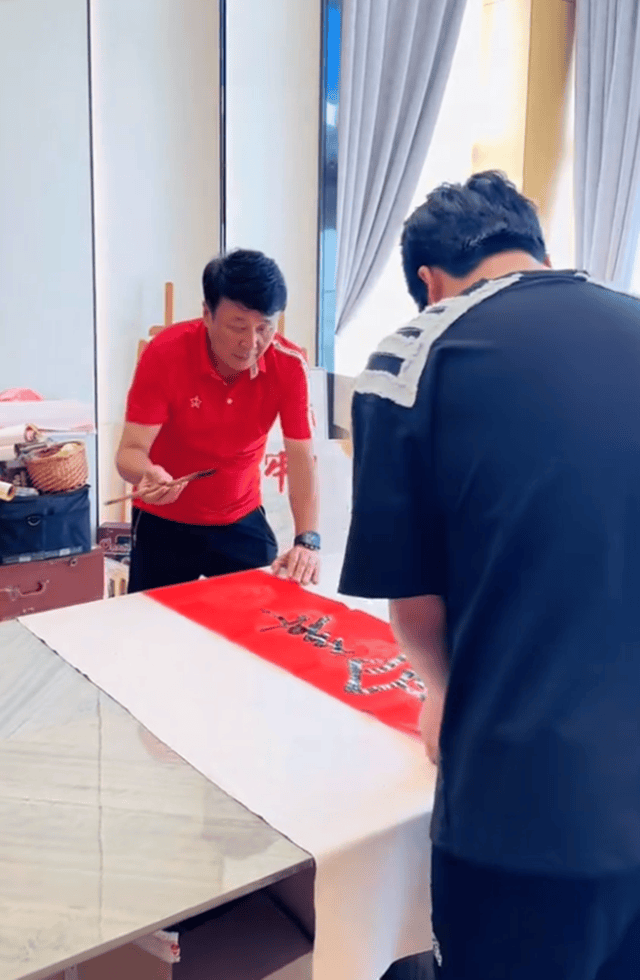 从郭斌晒出的视频来看,今年依旧是他亲自给家里写春联,视频中郭斌身穿鲜艳的红色短袖T恤,搭配黑色长裤。只见他正俯身于一张铺有白色桌布的长桌前,右手持毛笔在红色的宣纸上专注地书写着,左手则轻轻按住纸张以保持稳定,动作显得沉稳而专注,写起字的郭斌笔画流畅、气势连贯,显示出一定的书法功底。